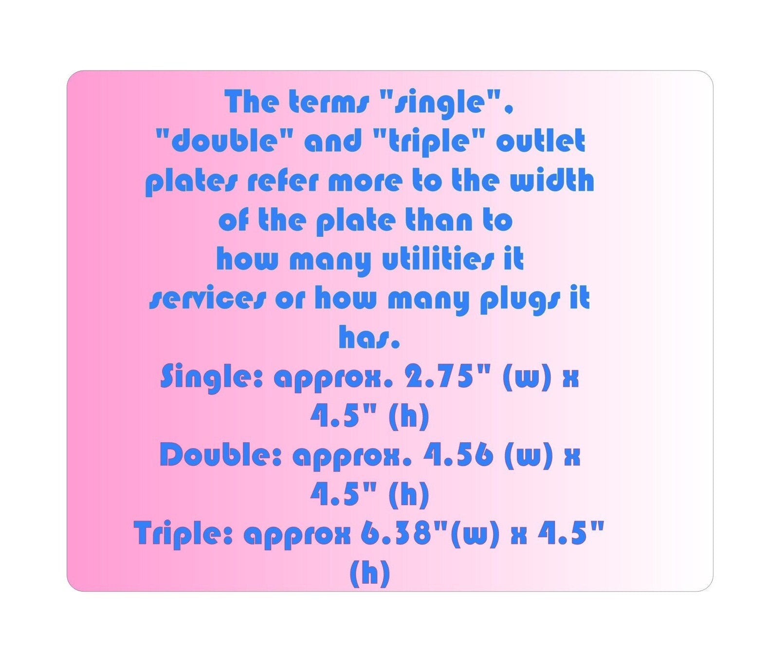 I provide standard & midsize plates but can accommodate larger sizes when requested. Just need to ask. (Please be sure to measure your outlet box before ordering to get the correct size.)