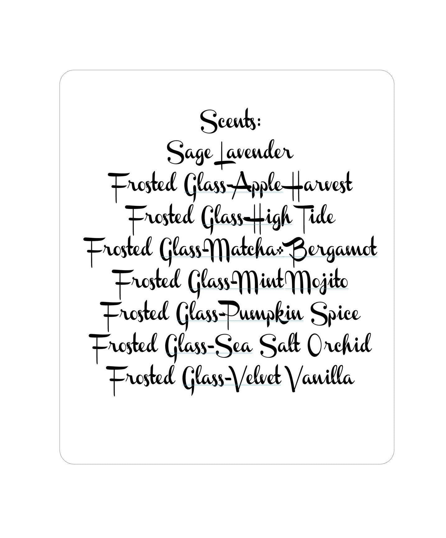 WhiteSageLavender * FrostedGlass-AppleHarvest * FrostedGlass-BlackSea * CactusFlowerJade* * CoconutLimeVerbena * FrostedGlass-FreshCutGrass * FrostedGlass-HighTide * FrostedGlass * Matcha+Bergamot * FrostedGlass-MintMojito * FrostedGlass-PumpkinSpice * FrostedGlass-SeaSaltOrchid * FrostedGlass-VelvetVanilla