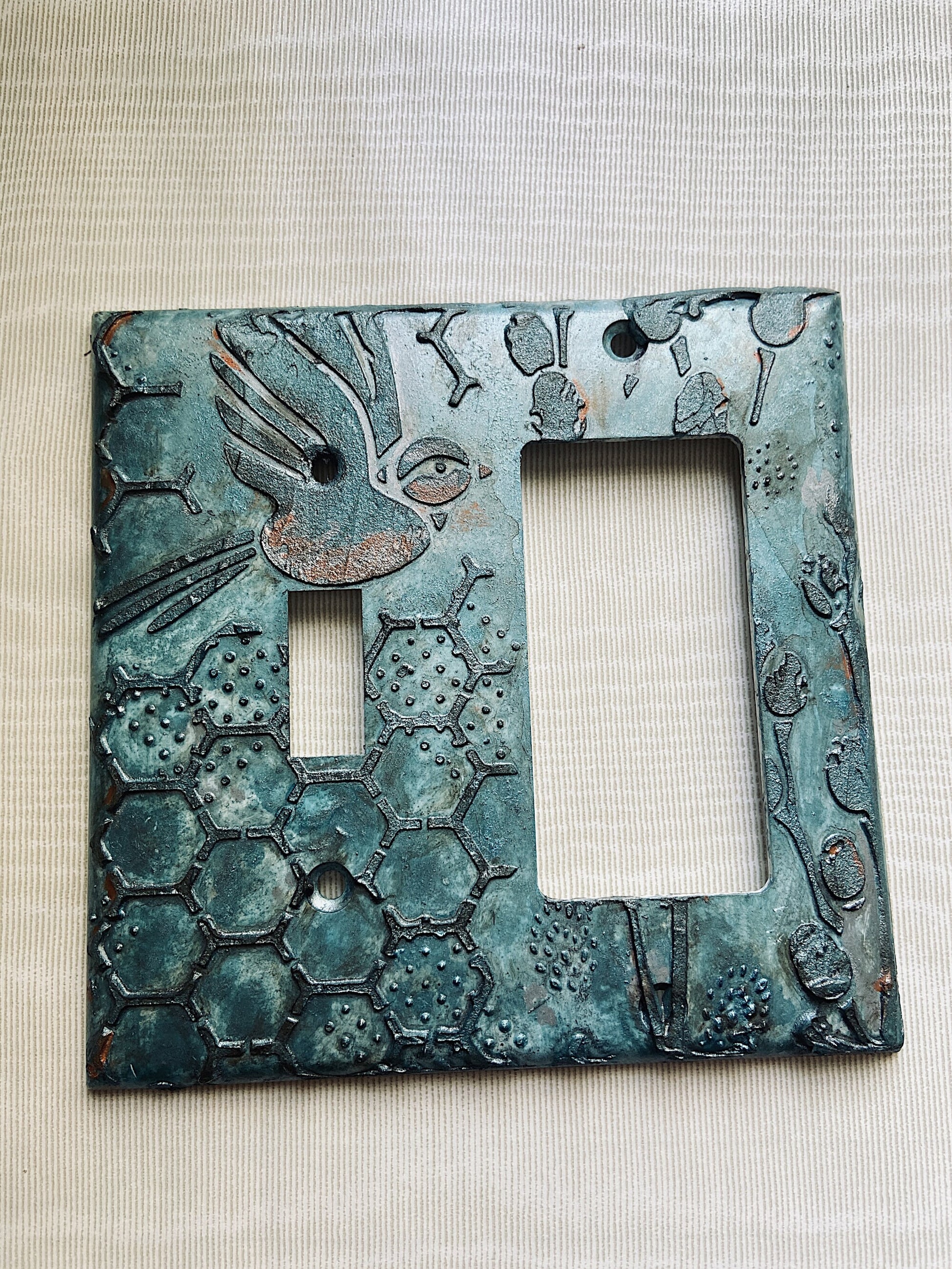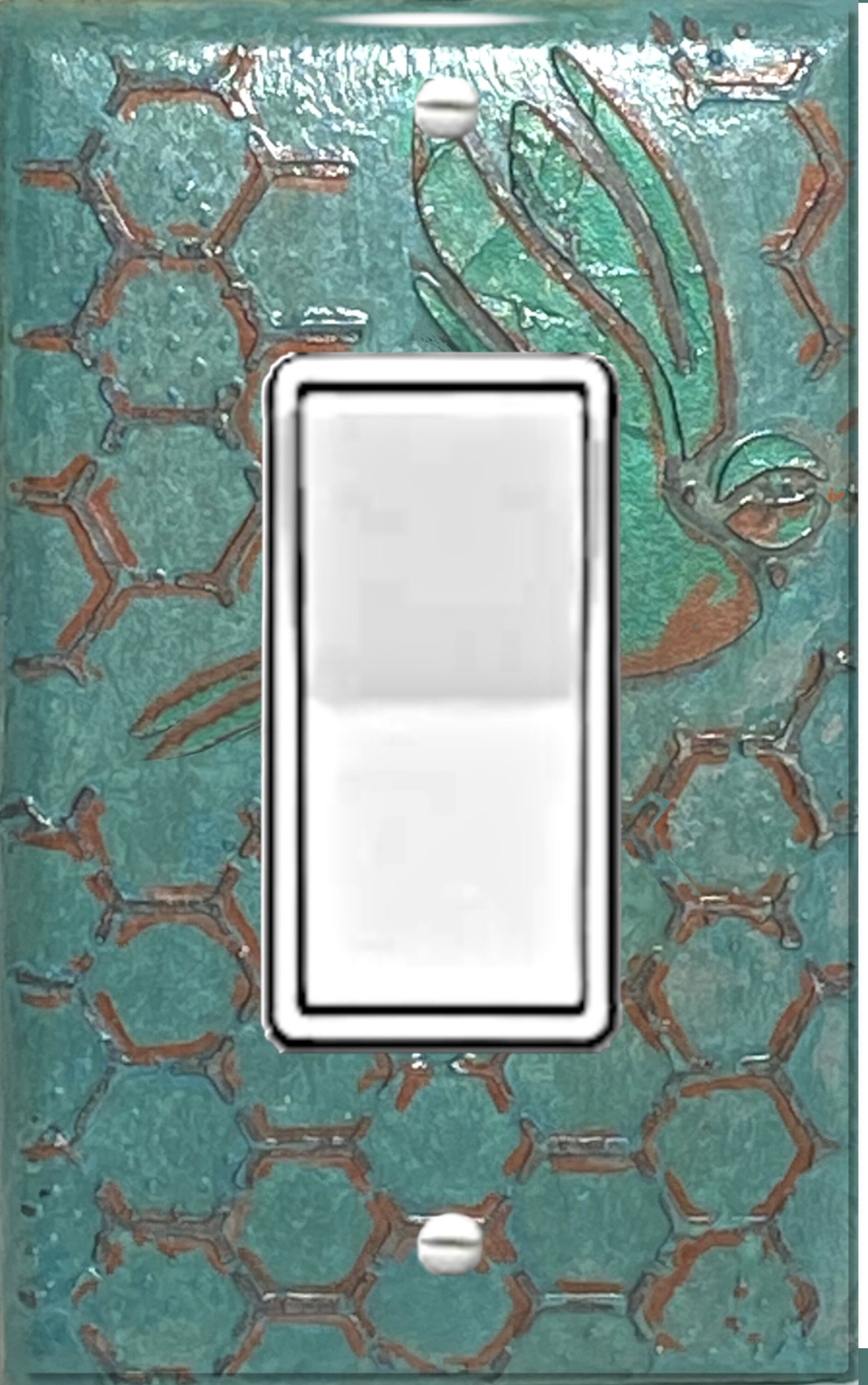 Enrich your home decor with this pretty teal switch plate cover, meticulously hand-crafted, 3D embossed, and hand painted. Adorned with intricate honeycomb patterns and a graceful blue bird in flight, it adds an enchanting touch to any room. Say goodbye to boring decor.