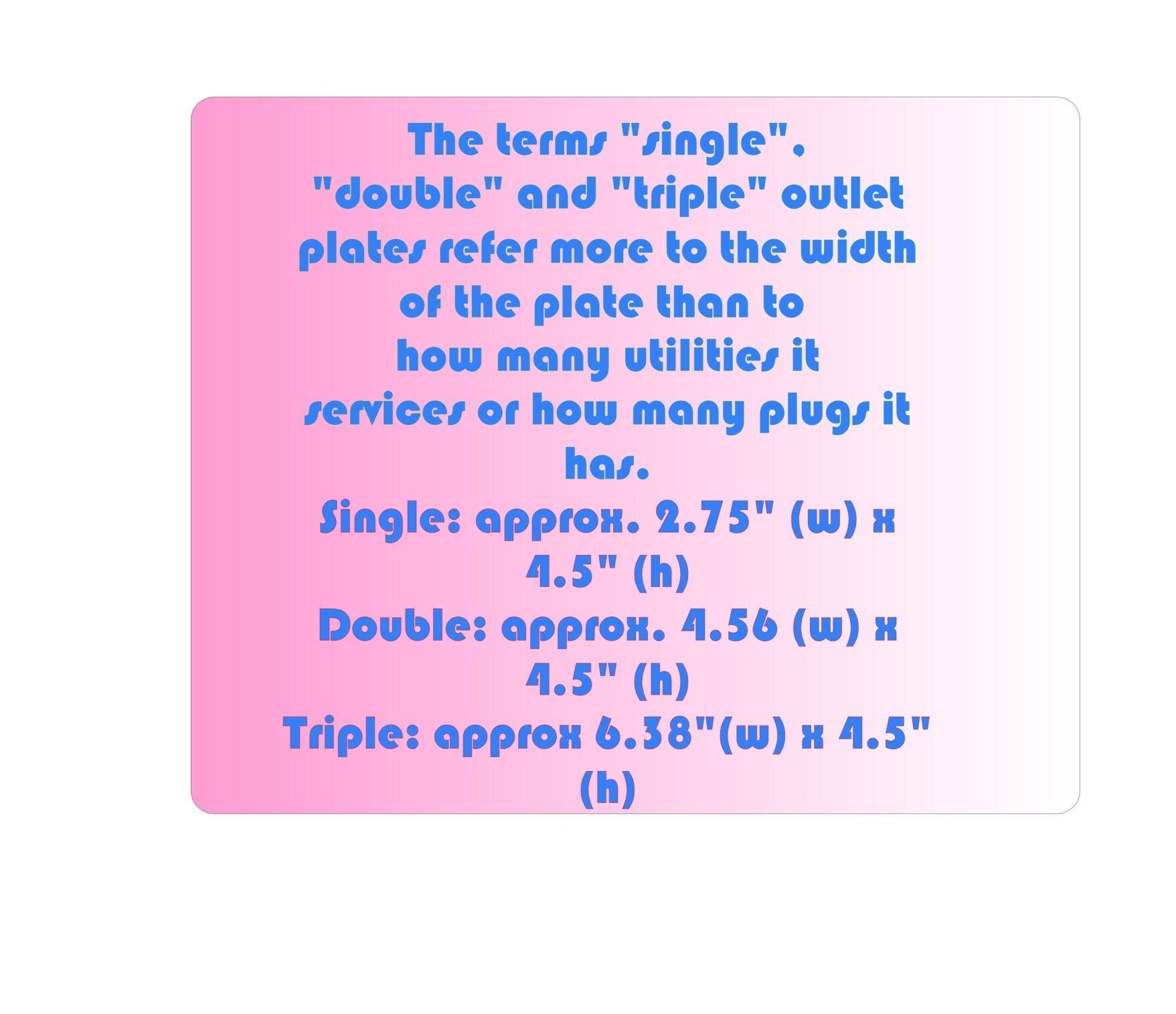 I provide standard & midsize plates but can accommodate larger sizes when requested. If you need a particular size, please let me know at the time of order. (Please be sure to measure your outlet box before ordering to get the correct size.)