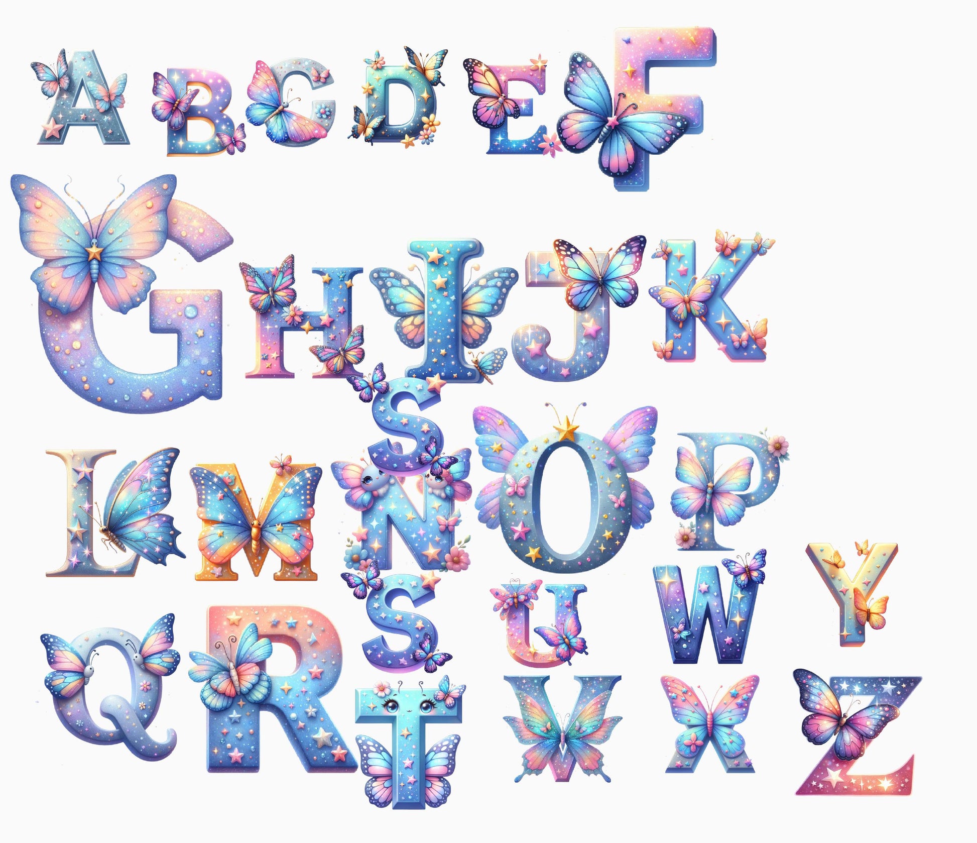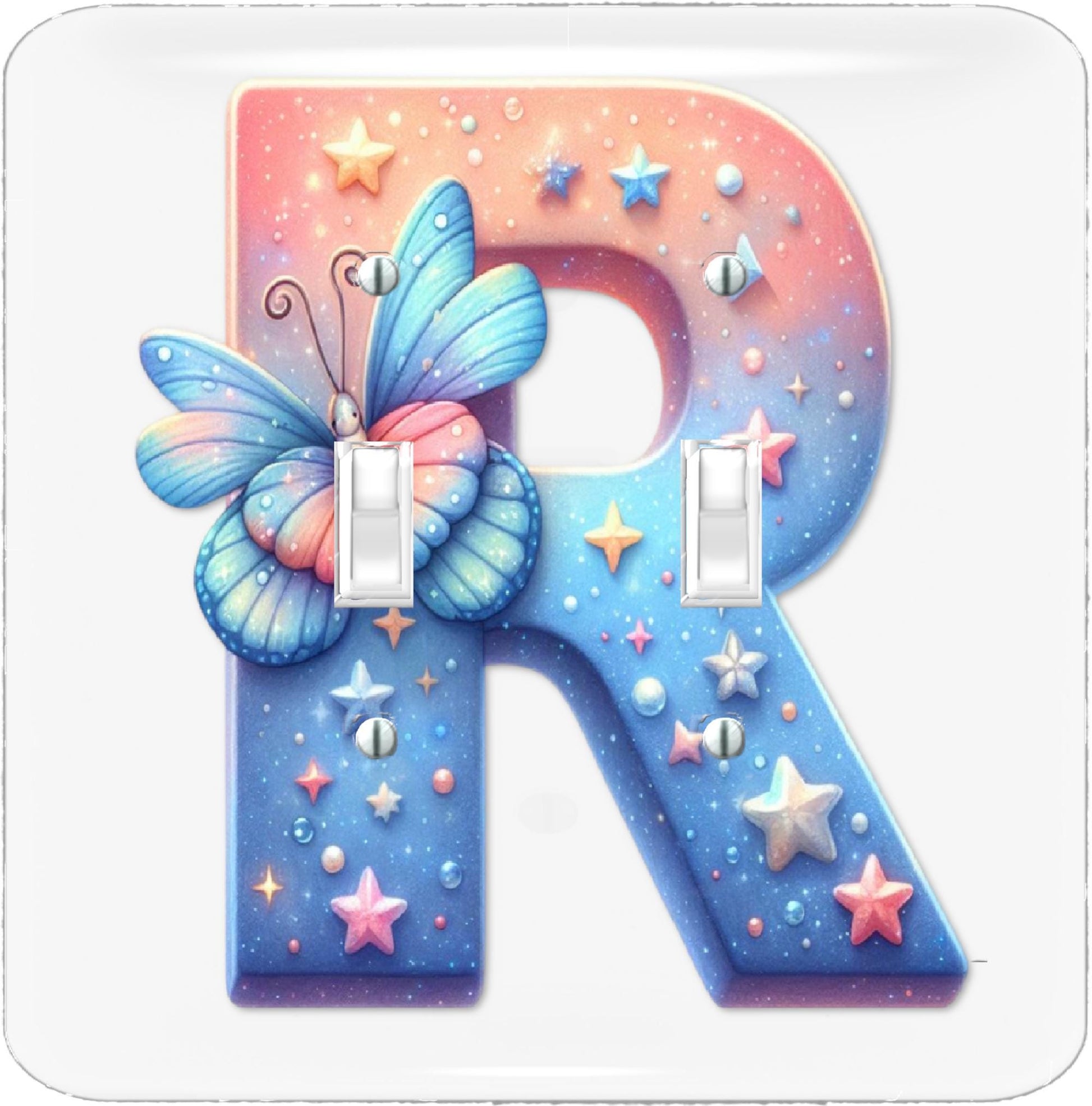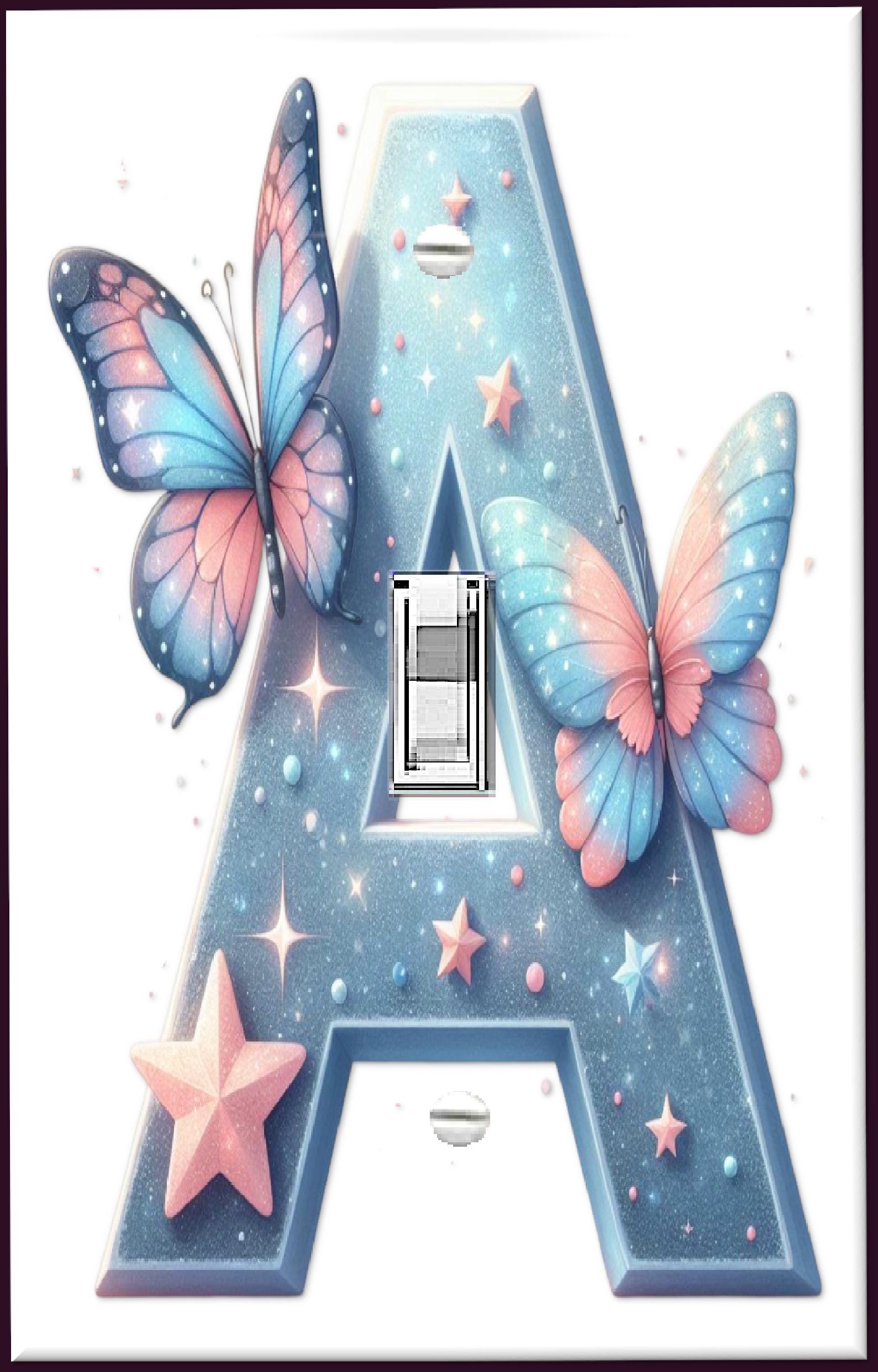 Personalized charm for your child’s room with this Alphabet & Butterflies Light Switch Cover, featuring your child's initial. This whimsical design showcases a starry sky backdrop adorned with soft pastel butterflies and sparkling stars, perfect for creating a magical atmosphere.