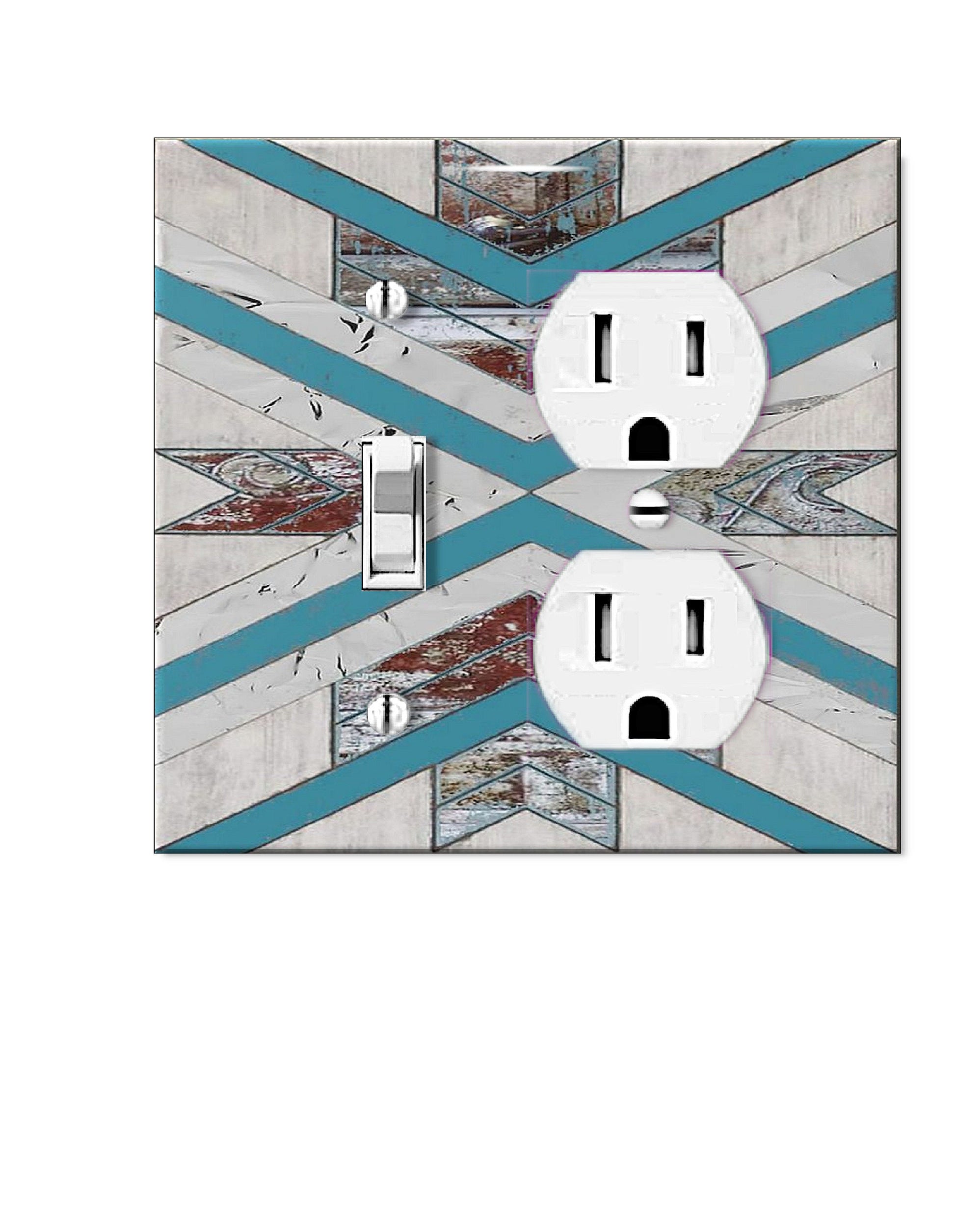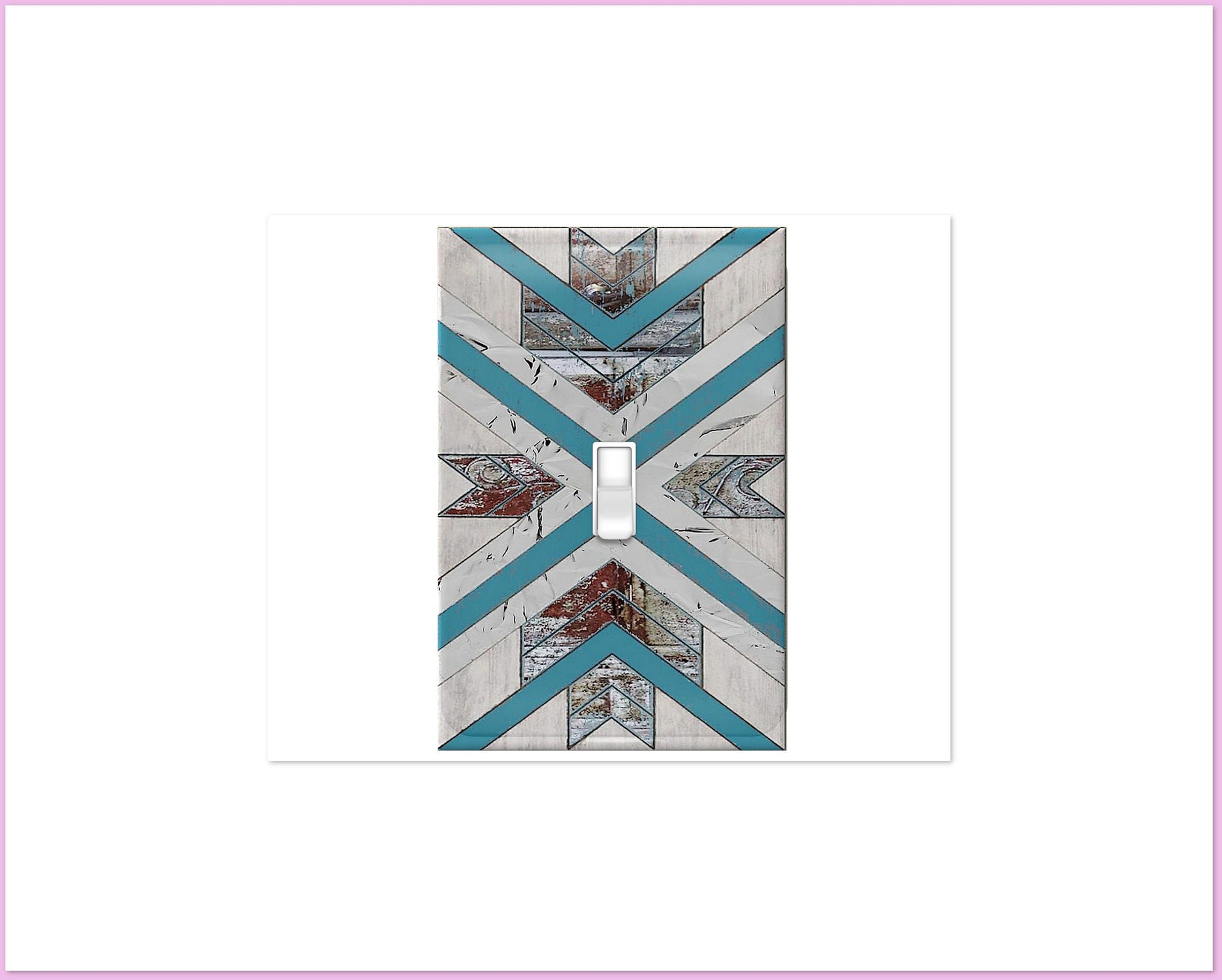 Enhance your home with this Rustic Boho Chevron Light Switch Cover, featuring a stunning Southwestern geometric design in shades of blue, white, and distressed wood textures. This eye-catching switch plate adds a touch of farmhouse charm while blending effortlessly with modern, western, or rustic decor styles.