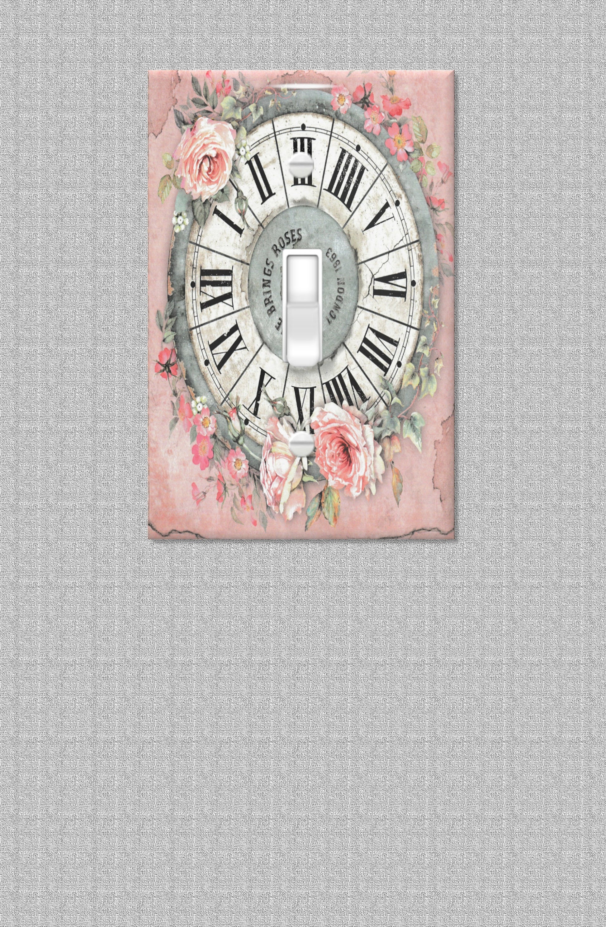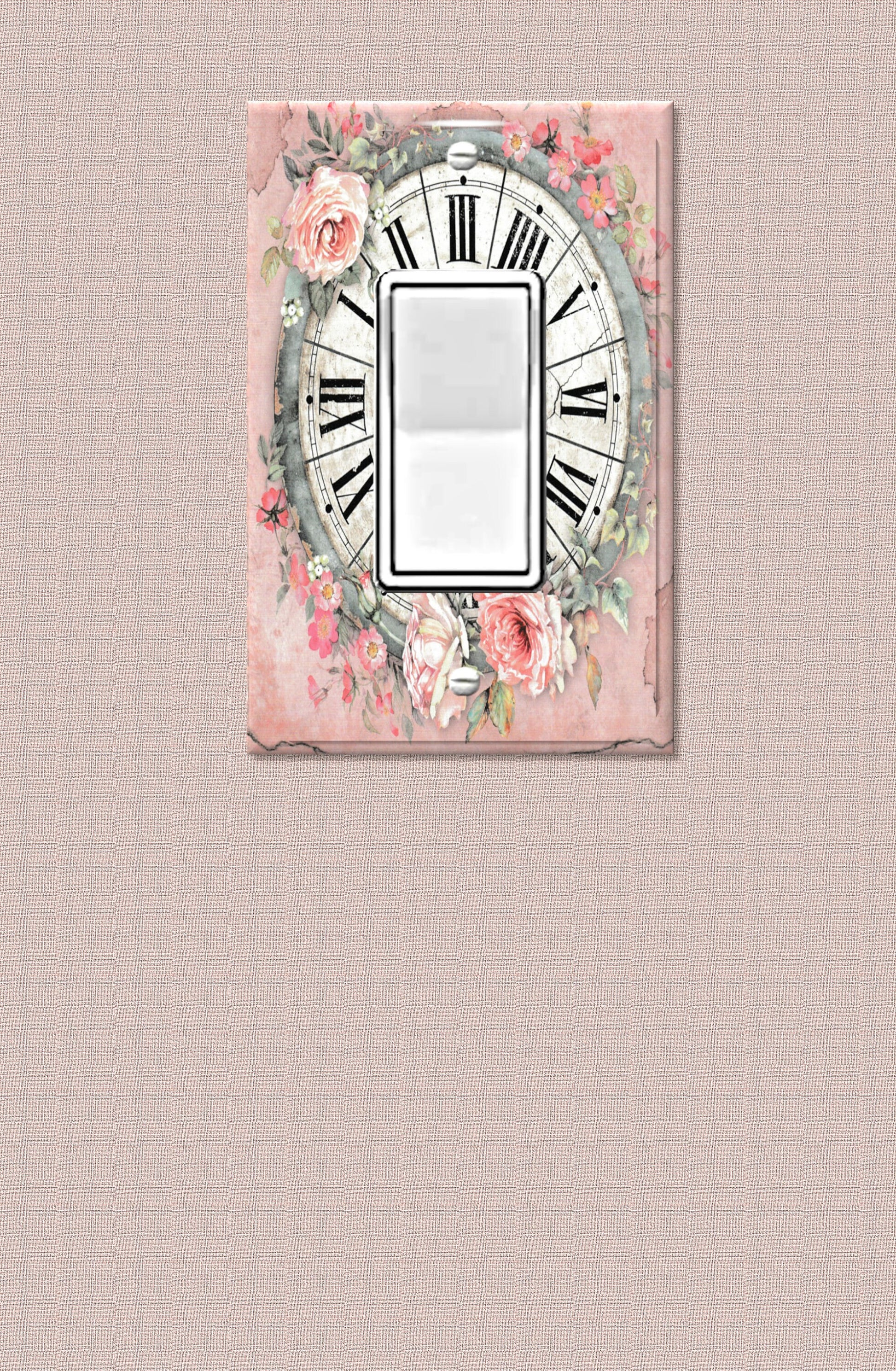 Shabby Chic Light Switch Cover Switchplate, Antique Clock Outlet Cover, Wall Plate with Pink Roses, Switch Plate Toggle Duplex Decora Plate