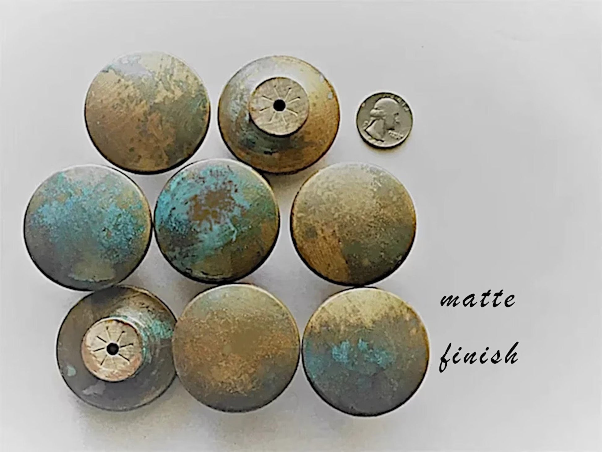 A SPECIAL NOTE & CLARIFICATION ABOUT PATINA: The oxidation process that causes the blue/green patina on any surface is a chemical reaction. And patina has a mind of its own! While I can combine the materials on the wooden knob that cause the oxidation, once the oxidation process begins, I am unable to control how it develops into its beautiful pattern. It may turn out to be more green, or more blue. It is an awesome process that I am constantly amazed by. What my product pictures depict is a SAMPLING of how Your Knobs may turn out.
